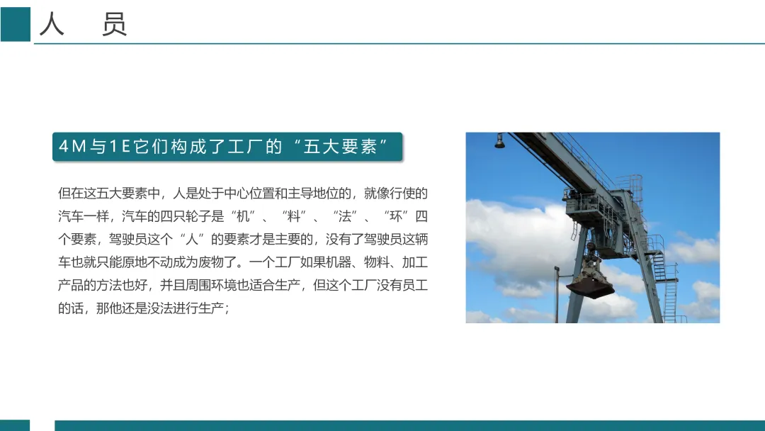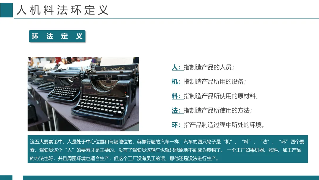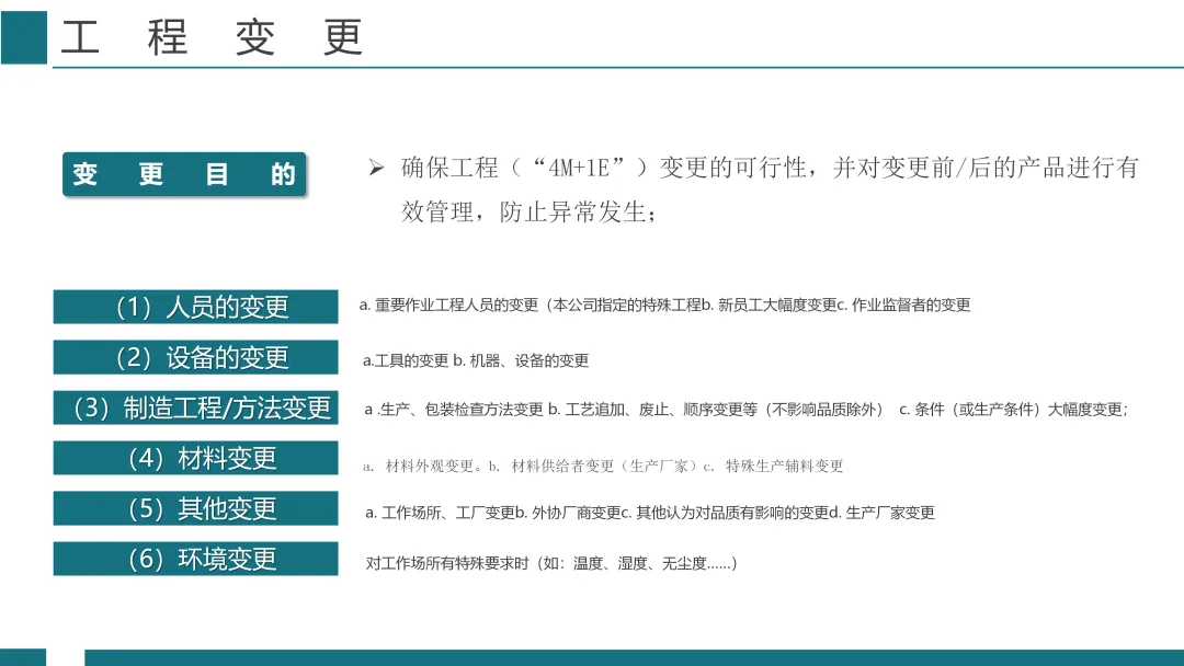 造成产品质量的波动的原因主要有六个因素:Man(人)、Machine(机) 、Material(料) Method(法) 、Measurement(测)、Environment(环)。常简称为5M1E。六要素只要有一个发生改变就必须重新计算。