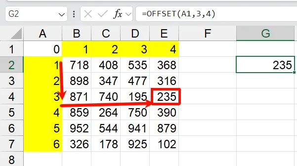 =OFFSET(A1,3,4)从A1开始