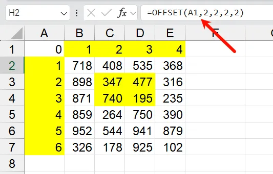 OFFSET(reference, rows, cols, [height], [width])