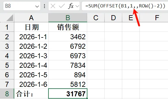 =SUM(OFFSET(B1,1,,ROW()-2))效果如下