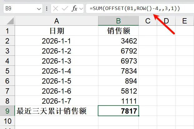=SUM(OFFSET(B1,ROW()-1-N,,N,1)),ROW()是当前行号,假设从第8行开始统计最近7行需求:查找1月8日销售额