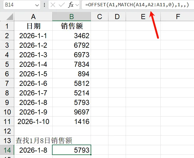 =OFFSET(A1,MATCH(A14,A2:A11,0),1,,)#REF!错误: 偏移超出工作表边缘原因:rows/cols偏移后超出工作表范围。