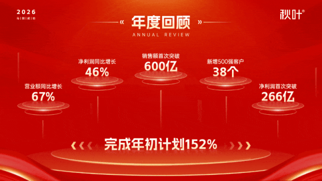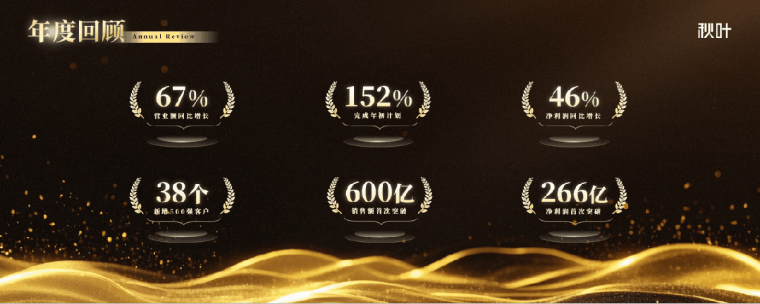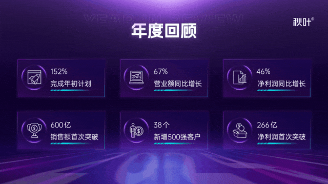 像年终总结中的年度回顾,用一页 PPT 把年度关键数据展示出来,可使用数据+说明分两行排列,再放大加粗数据,增强冲击力。