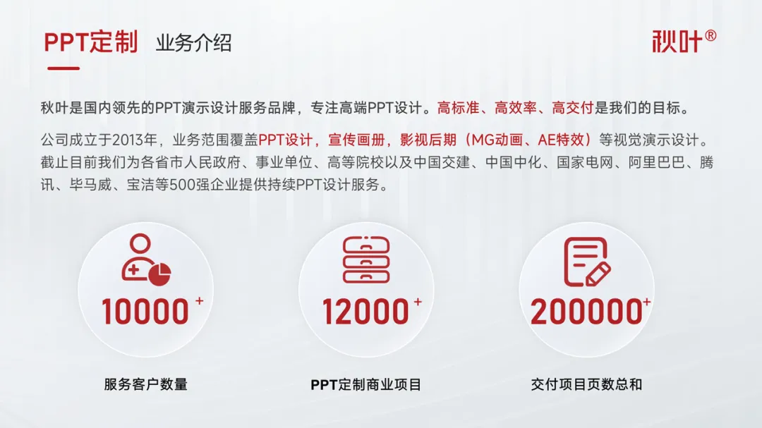 展示具体业务或项目情况时,需要用大段文字描述具体情况,仍可以把关键数据拎出来,单独放大展示,作为页面的视觉焦点。