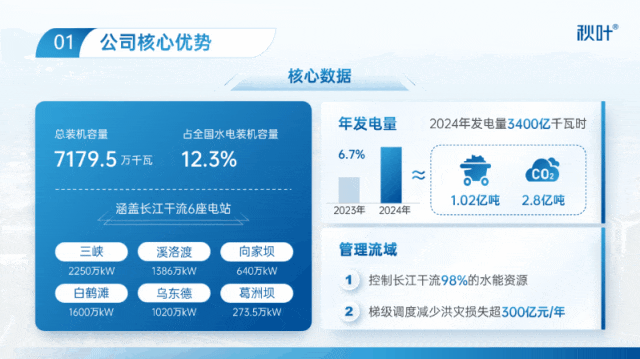 例如用上升箭头表示年发电量增长,下降箭头表示节约了多少资源、减少了多少排放。