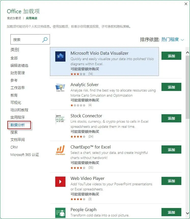 比如点击数据分析,相关加载项就在右边列示出来。