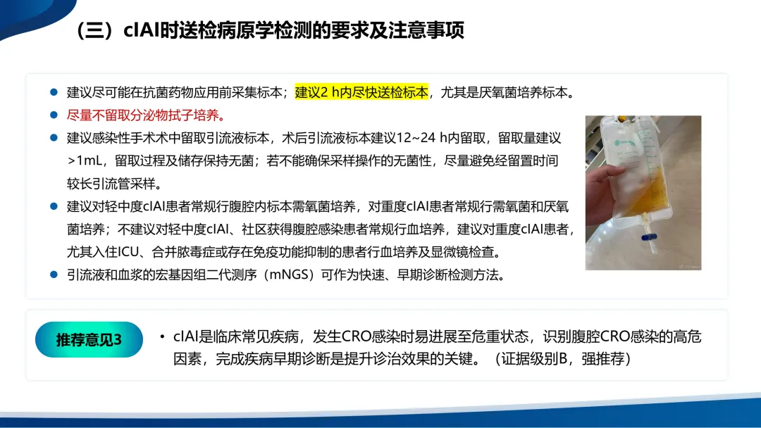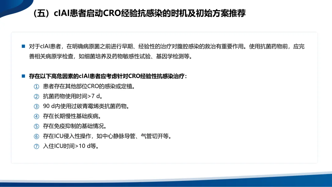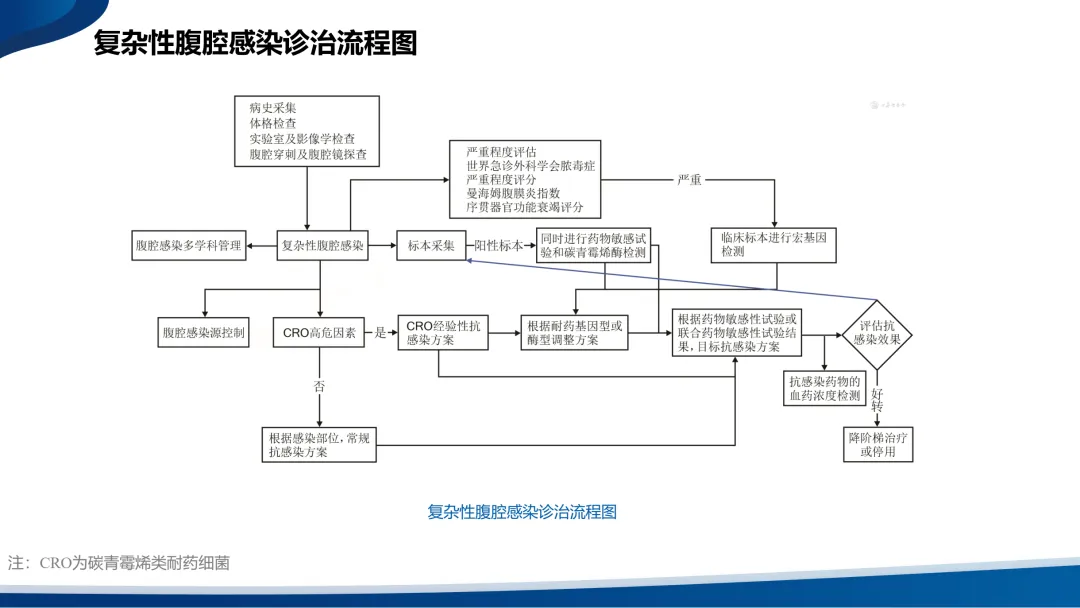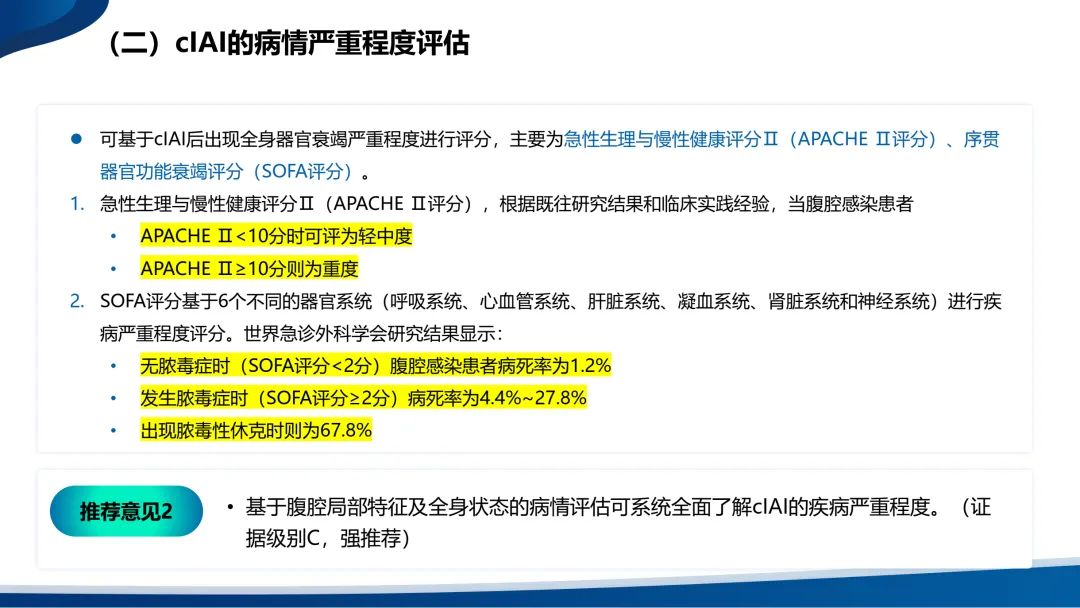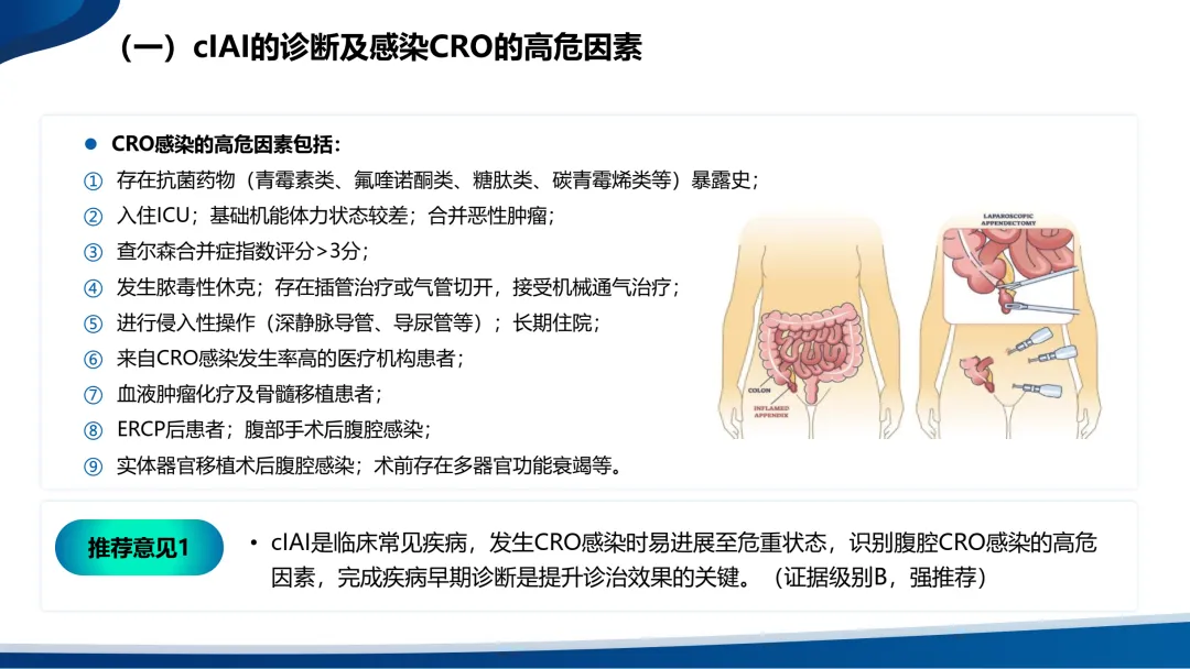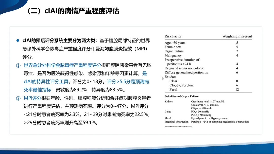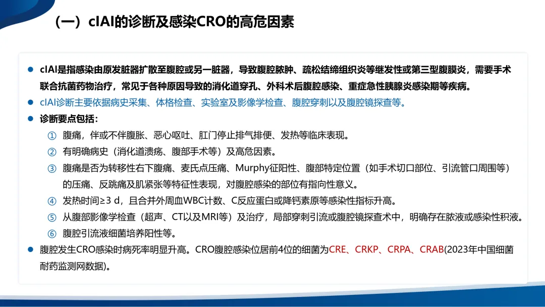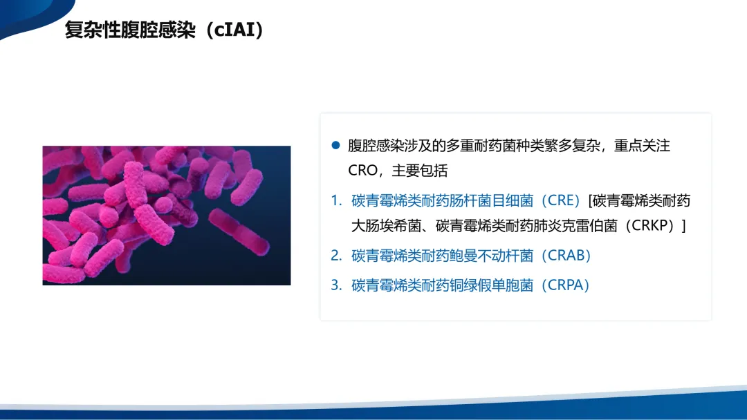 •复杂性腹腔感染(cIAI)则扩展至腹腔的无菌区域,包括腹腔、肠系膜、腹膜后、其他腹腔器官或腹壁。