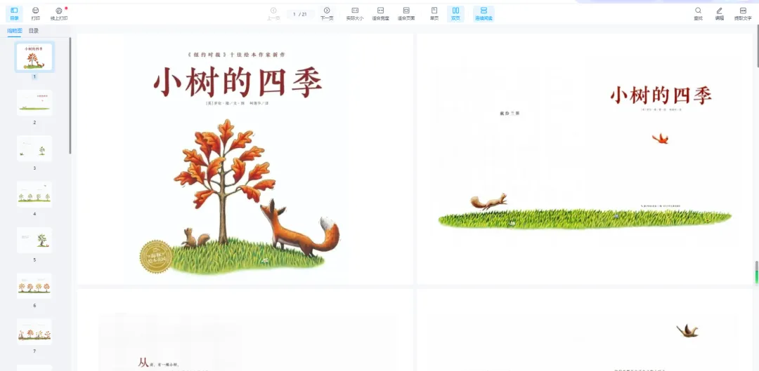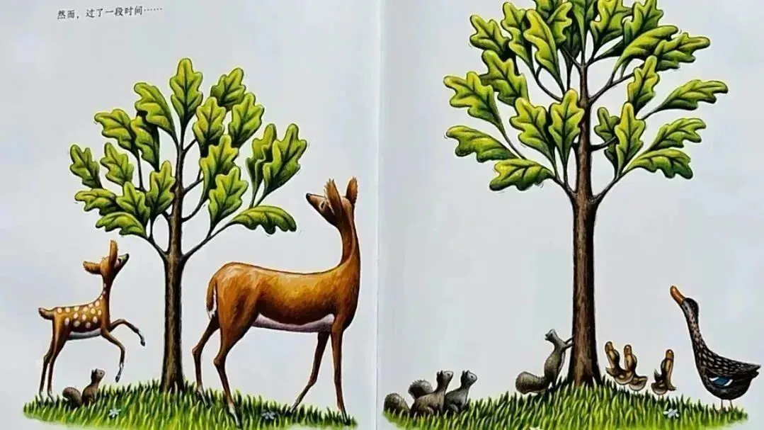 绘本阅读是幼儿教育的重要方式,但许多家长因孩子不识字或价格高而忽视其价值。实际上,绘本通过图文结合能同时刺激儿童的视觉和语言发展。优质绘本能提升儿童的认知、语言和社交能力。长期阅读对学业发展和亲子关系都有积极影响。绘本既是学习工具,也是亲子互动的桥梁。绘本PPT通过丰富多彩的故事和生动的画面,激发幼儿园儿童的学习兴趣,培养他们的阅读能力、想象力和创造力。 绘本PPT电子版画册涵盖了各种主题和风格,包括寓言故事、科普知识、生活常识、人际交往等方面,满足不同年龄段儿童的阅读需求。这些绘本不仅具有丰富的故事情节和精美的插图,还注重文字表达简洁易懂,适合幼儿园儿童阅读和理解。森林里有一棵小树,春天小树和同伴们一样,长出了嫩绿的叶子,夏天叶子越来越茂盛,叶子为他避暑,动物们来一起玩耍。秋天来了,树叶渐渐变色和枯萎,当其他树的叶子纷纷落下时,小树紧紧地抓住自己的叶子,无论动物们怎样劝说。冬天来了,只有小树的枝头还挂满枯黄的叶子。春天又来了,其他小树长出了新叶子,小树依然不敢放手,小小地站在原地。春去秋来,有一年夏天,小树发现自己看不到阳光了,因为其他的大树完全遮盖了他,动物们也离他而去。终于,他鼓起勇气,开始放手,寒冬之后,小树也迎来了自己的新生和蜕变。