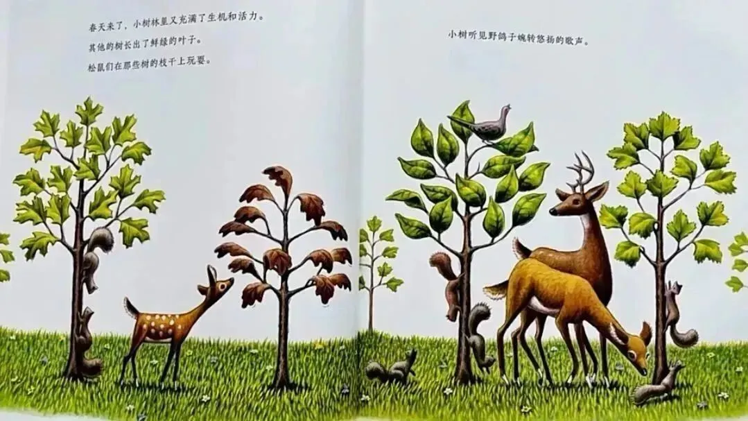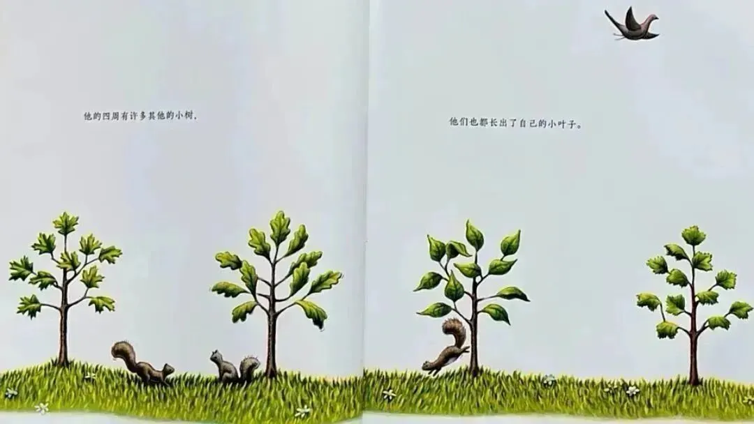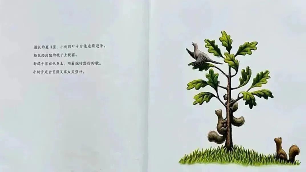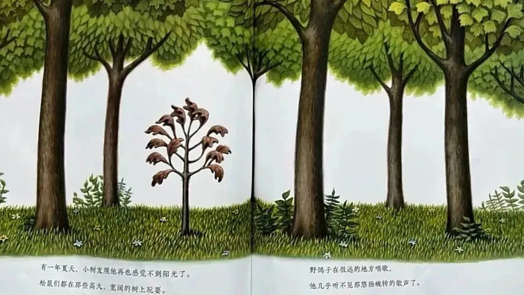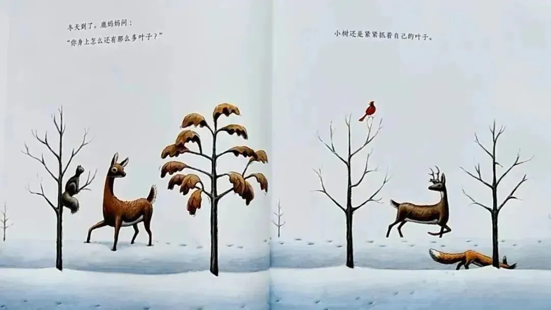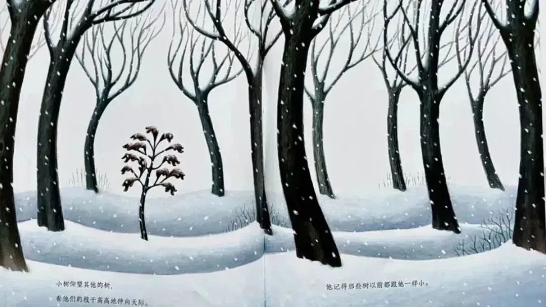 这是一个描述⼀棵⼩树如何在坚强中成长的故事。在绘本中,我们看到了⼩树的独立、坚持与不妥协。在不断地挣扎和困惑中,他对外部环境逐渐适应并做出了改变。最终,他像其他小树⼀样,放手让自己的叶⼦飘落到大地,去感受冬天的寒冷,然后体会到春日树叶新生的惊喜和不断长高的愉悦。