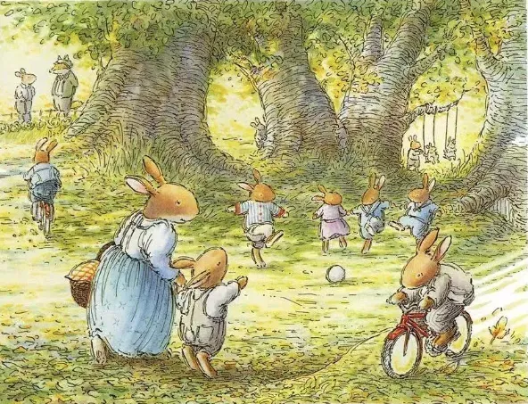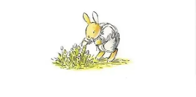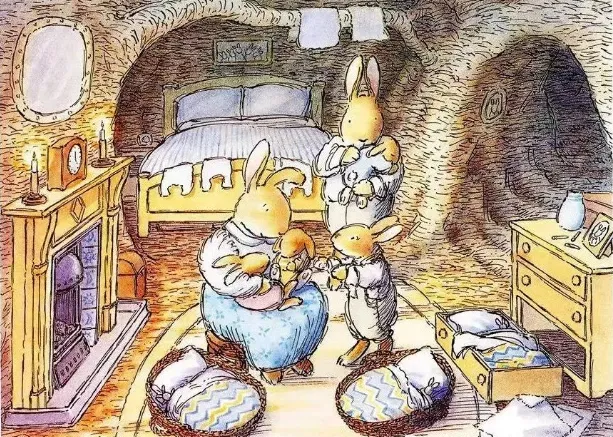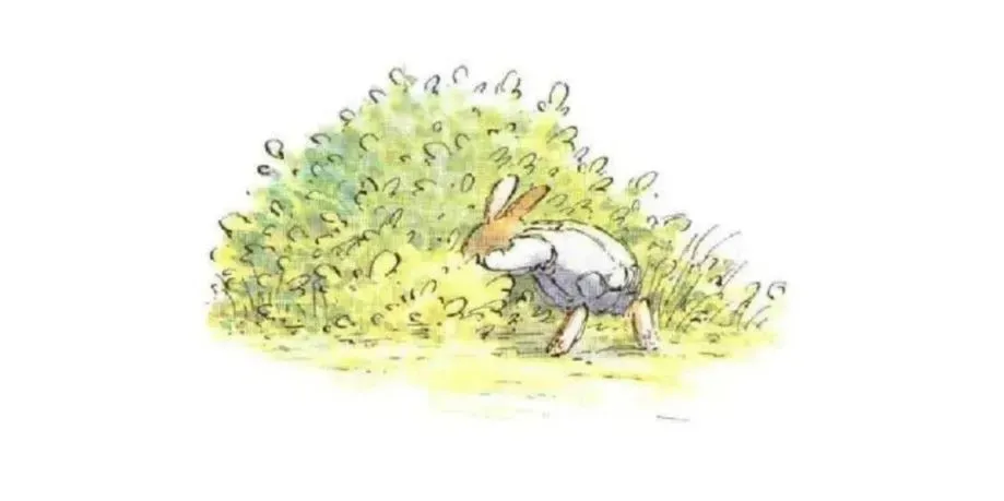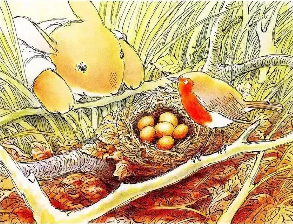 他到草丛和荆棘中找,也没有找到小弟弟,只看见一个鸟窝,里面有六只长着斑点的鸟蛋。“这儿没有小兔子。”知更鸟说。