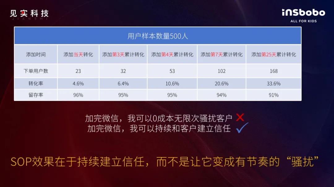 后面25天周期里,我们发现第1天/第2天转化只有4.6%/6.4%,但到第25天能做到33%,留存还在90%+,靠的不是无限骚扰,而是持续建立信任关系、用“发货后我会在微信留言”等服务埋点创造二次沟通机会。