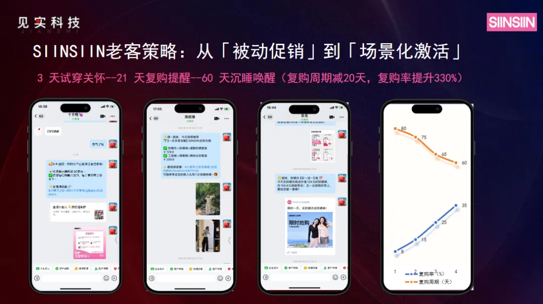 3、在复购上我们不靠群发,而是跑一套30天守护SOP:第3天做试穿关怀、收集版型和材质反馈给产品部,21天做穿搭型复购推荐,60天做换季唤醒,把复购周期从80多天压到60多天,复购率从5%提升到 35%。