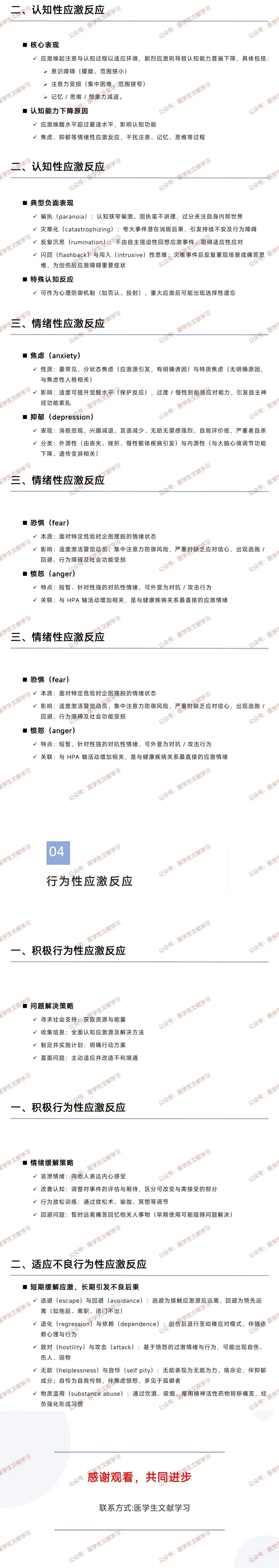 - 核心表现:适度应激唤起认知适应环境,剧烈应激导致认知能力下降(意识障碍、注意力集中困难、记忆 / 思维减退)。