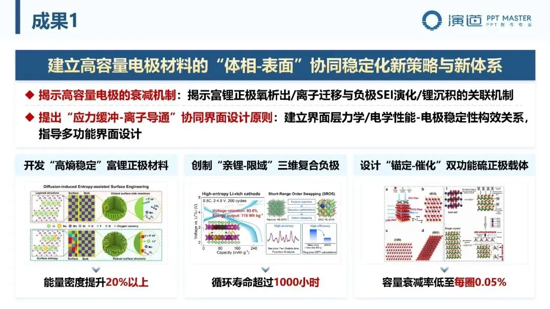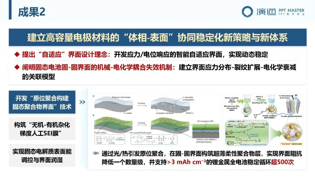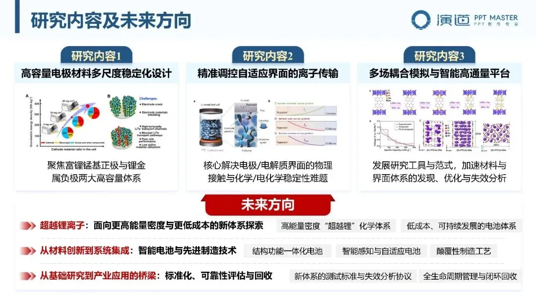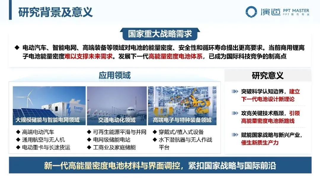 PPT 以 “研究背景及意义 — 技术挑战及解决方案” 为主线,先阐明国家战略需求与应用领域,明确研究的科学与产业价值;再梳理材料、界面、系统集成三大核心挑战,提出 “材料革新 — 界面调控 — 系统集成” 的技术路线,逻辑清晰、层次分明,凸显问题导向与技术可行性。