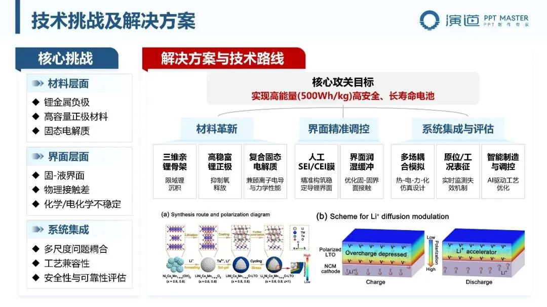 核心目标为实现 500Wh/kg 高能量密度电池,技术路线分三大维度:材料革新突破锂金属负极、高容量正极、固态电解质等关键材料瓶颈;界面精准调控解决固 - 液界面物理接触差、化学 / 电化学不稳定问题,优化 SEI/CEI 膜与界面润湿;系统集成与评估通过多场耦合模拟、原位表征及智能制造,实现多尺度问题耦合与工艺优化,构建从材料到系统的全链条解决方案。