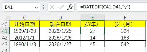 以计算今年多少岁为例子,引入函数名DATEDIF (datedif)