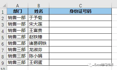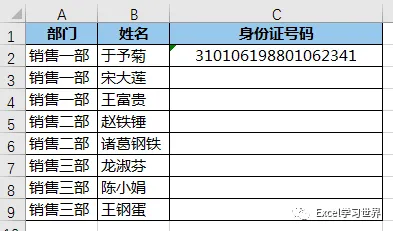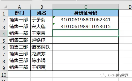 6. 重新输入正确的身份证号码后回车,只要身份证号码跟 C 列中已经存在的不重复,就完全没有问题。
