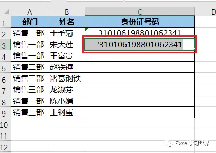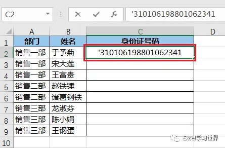 1. 先输入一个英文半角的“'”符号 --> 紧接着输入身份证号码