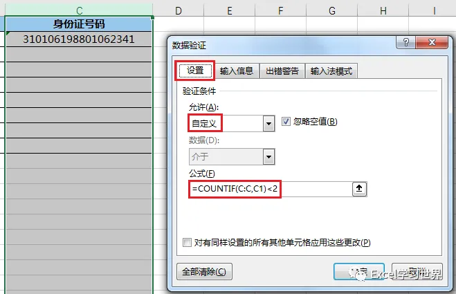 3. 在弹出的“数据验证”对话框中选择“设置”选项卡 --> 在“允许”下拉菜单中选择“自定义”--> 在“公式”区域输入以下公式: