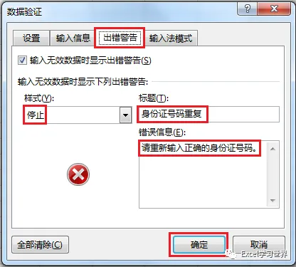 下图为某公司员工信息登记表,C 列中需要输入身份证号码,为了防止减小出错概率,当输入重复身份证号时,需要弹出如下图所示的出错警示框,阻止录入。