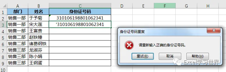 现在就设置完成了,如下图所示,如果在任意单元格内输入一个已经存在的身份证号码,就会弹出右边的警示框,要求重试或者取消。