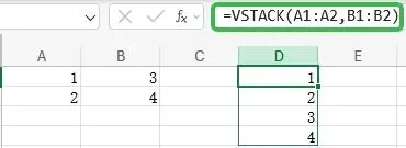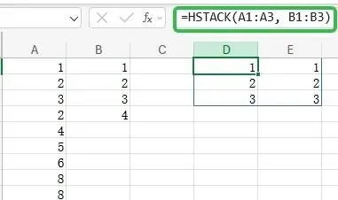 | 水平堆叠 | =HSTACK(A1:A3, B1:B3) | 将两列数据左右拼在一起 |