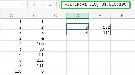 | 条件筛选 | =FILTER(A1:B10, B1:B10>100) | 返回所有数值大于 100 的行 |