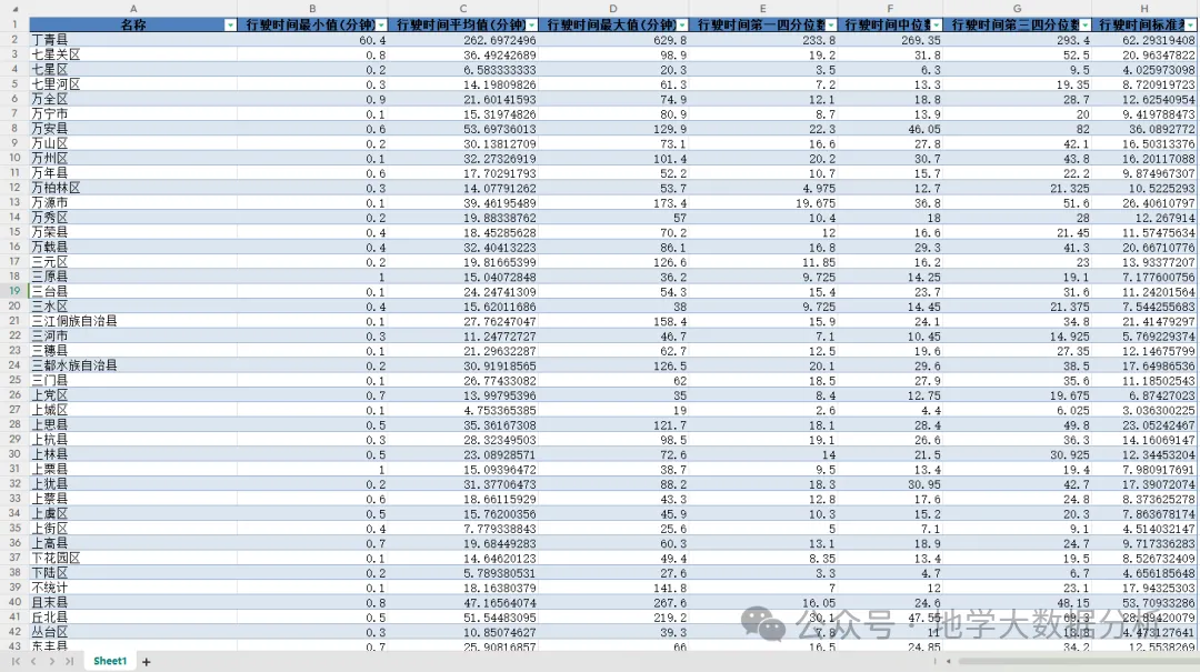 该数据集包含前往最近医院行驶时间前往最近一级医院行驶时间前往最近二级医院行驶时间前往最近三级医院行驶时间的最大值、最小值、平均值等指标,数据概览如下: