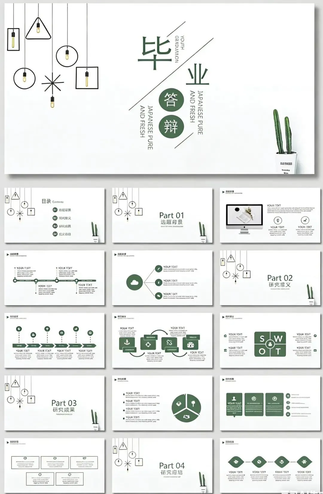 • 视觉特点:以浅绿为主色调,搭配简约的几何吊灯和仙人掌元素,营造出清爽、通透的北欧感。标题“毕业答辩”采用错落的艺术字排版,既醒目又不失设计感。