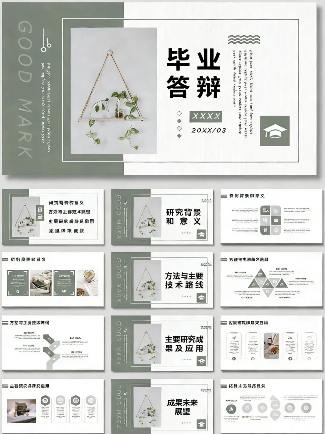 • 视觉特点:以莫兰迪绿为底色,搭配悬挂绿植的实景照片,营造出温馨治愈的文艺氛围。标题“毕业答辩”用粗黑字体突出,下方日期和留白设计增强呼吸感。