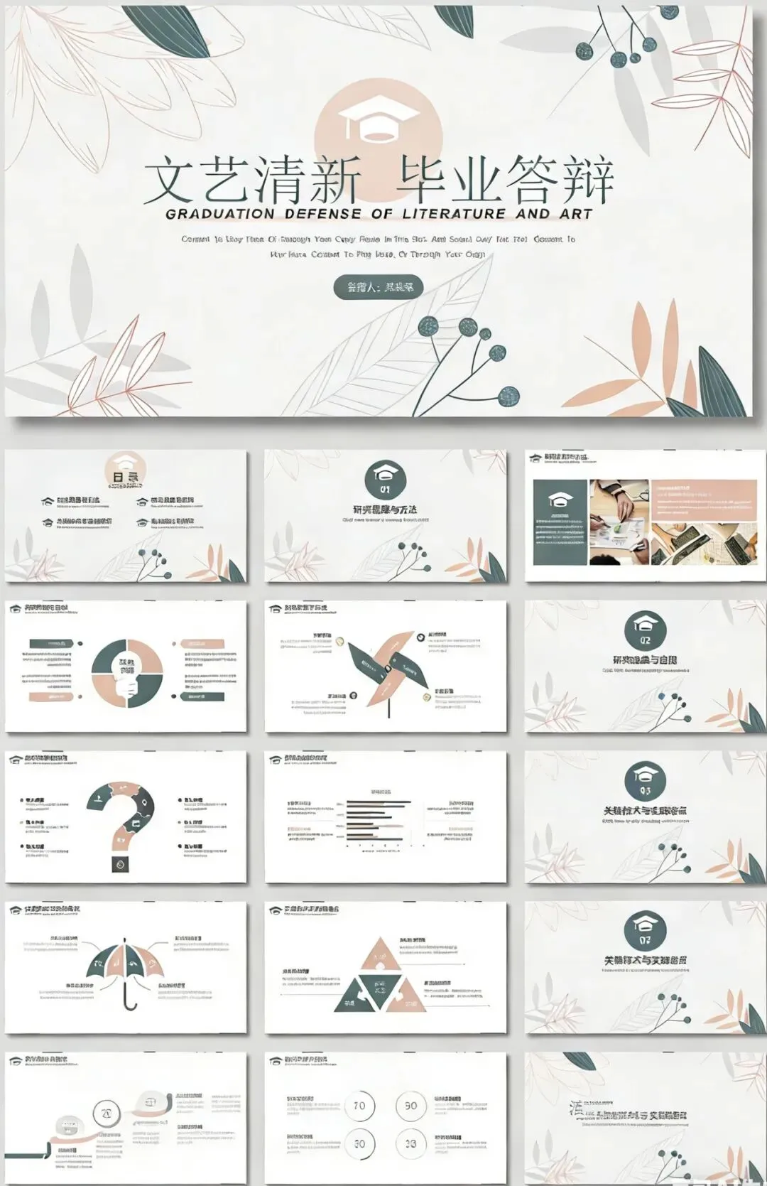 • 适配场景:适合文科、艺术类、教育学等需要展现人文温度的专业,尤其适合希望答辩氛围更柔和的同学。• 视觉特点:以浅粉、墨绿的手绘植物为背景,线条轻盈柔和,标题“文艺清新 毕业答辩”采用优雅的衬线字体,整体风格浪漫又不失学术感。