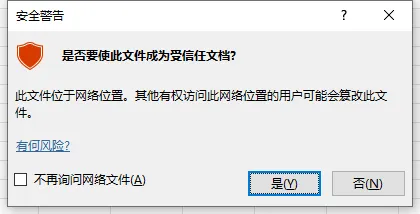 应该注意的是,图2弹窗用于询问用户意见。“是”表示完全信任当前文件,点击后此文件的宏代码可以运行,而且关闭后再打开也不会出现任何安全警告。“否”表示不完全信任当前文件,点击后此文件的宏代码虽然可以运行,但在关闭后再打开仍会出现图1黄色安全警告。点击右上角叉号关闭此弹窗相当于点击了“否”。