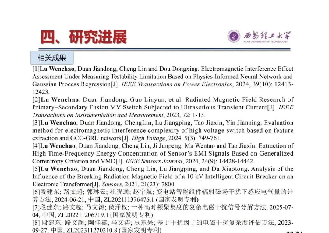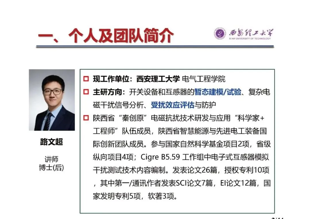 - 主讲人:路文超,西安理工大学电气工程学院讲师、博士(后),主研方向为开关设备和互感器的暂态建模/试验、复杂电磁干扰信号分析、受扰效应评估与防护,是陕西省“秦创原”电磁抗扰技术研发与应用“科学家+工程师”队伍成员及陕西省智慧能源与先进电工装备国际创新团队成员,参与国家自然科学基金项目2项、省级纵向项目4项,发表论文26篇,授权专利10项。