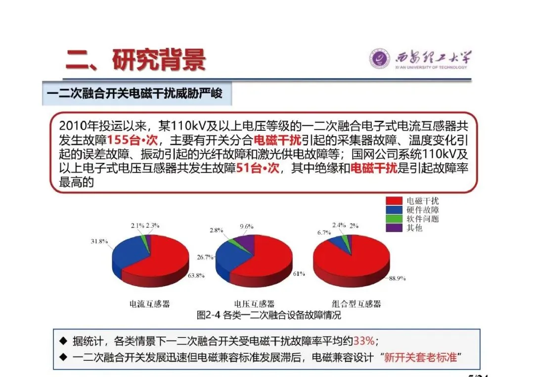 - 电磁干扰问题严峻:2010年投运以来,某110kV及以上电压等级一二次融合电子式电流互感器共发生故障155台·次,电子式电压互感器共发生故障51台·次,绝缘和电磁干扰是主要故障原因,各类情景下一二次融合开关受电磁干扰故障率平均约33%,且电磁兼容标准发展滞后,存在“新开关套老标准”的情况。