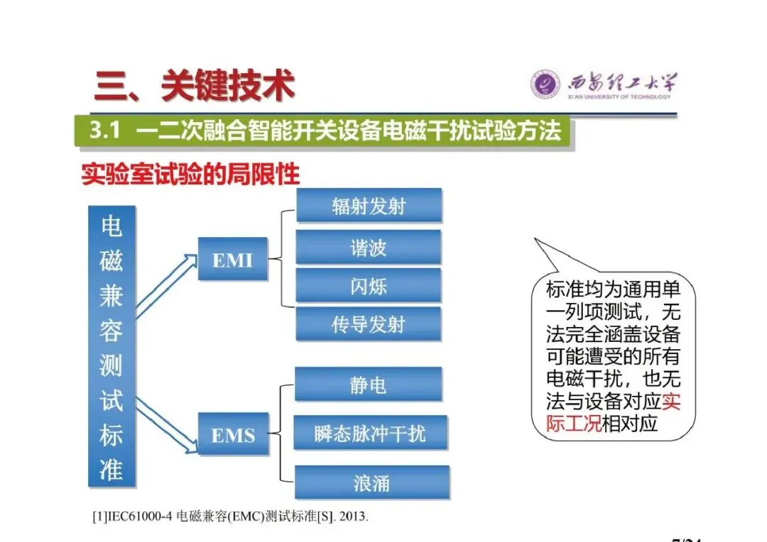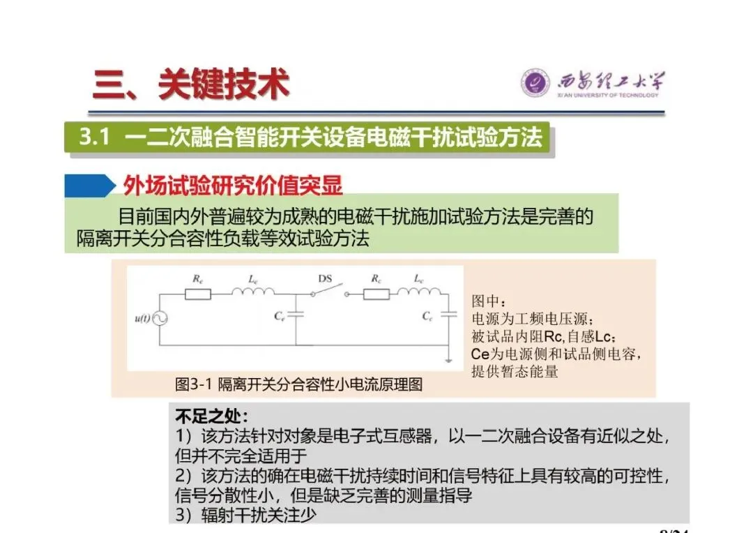 - 一二次融合智能开关设备电磁干扰试验方法:外场试验研究价值突显,目前国内外较为成熟的是隔离开关分合容性负载等效试验方法,但该方法针对电子式互感器,不完全适用于一二次融合设备,且缺乏完善测量指导、对辐射干扰关注少。