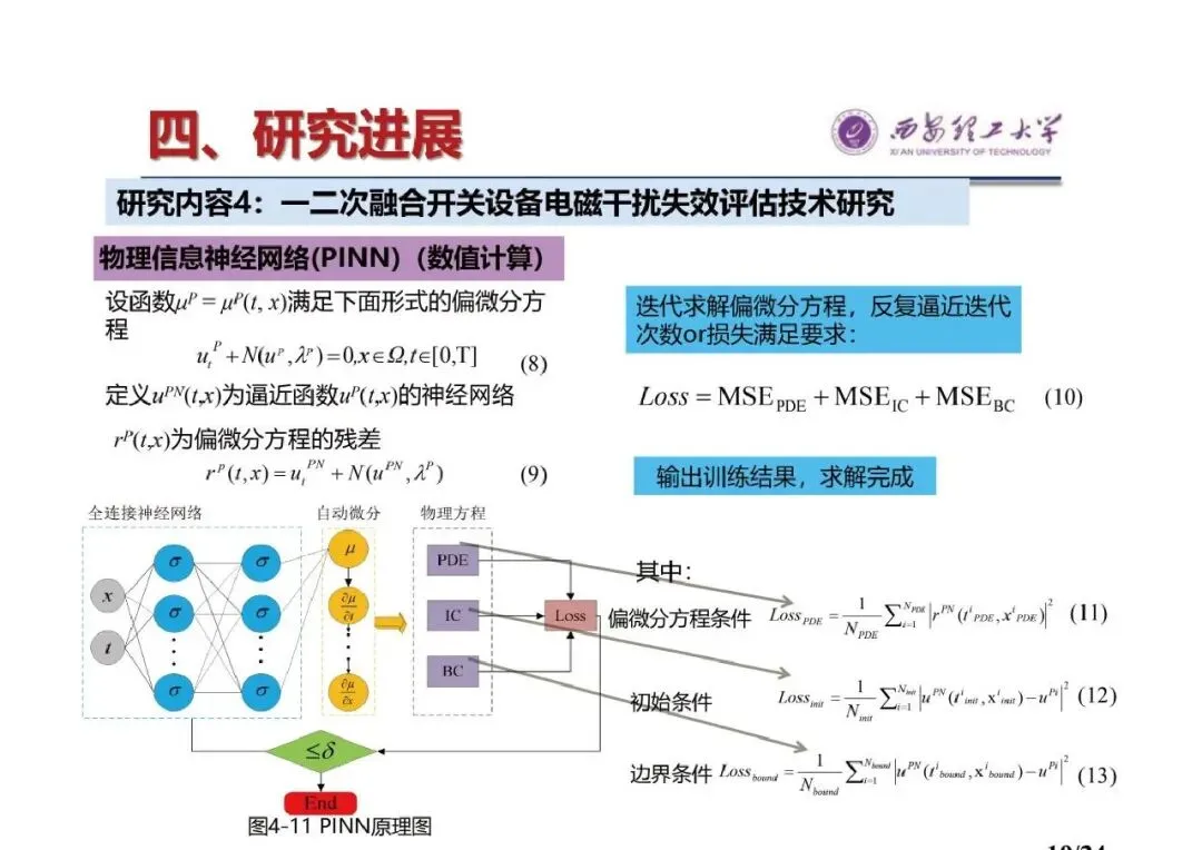 - 一二次融合开关设备电磁干扰失效评估技术研究:采用物理信息神经网络(PINN)进行数值计算,迭代求解偏微分方程,通过定义损失函数(Loss=MSEPDE+MSEIc+MSEBc)输出训练结果,还对二次电缆结构进行简化建模,依据变电站电压监测告警与否确定失效效应,开展了2D-GPR效应分布等相关研究。