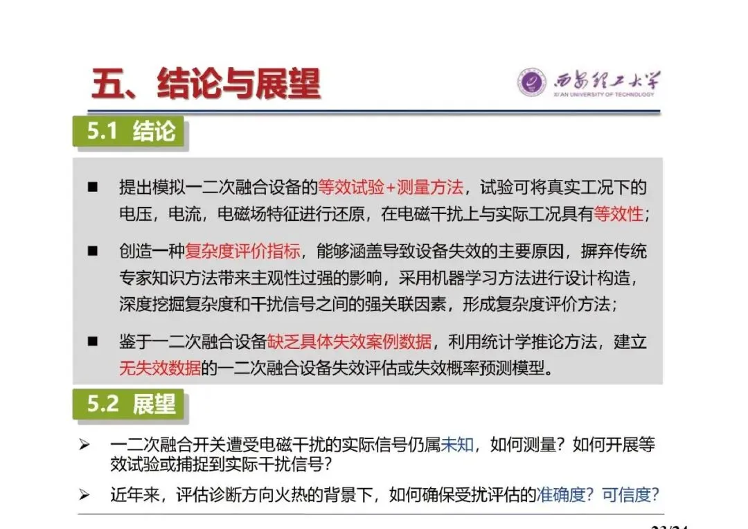 - 展望:一二次融合开关遭受电磁干扰的实际信号仍属未知,需解决如何测量、如何开展等效试验或捕捉实际干扰信号的问题;在评估诊断方向火热的背景下,需确保受扰评估的准确度和可信度。