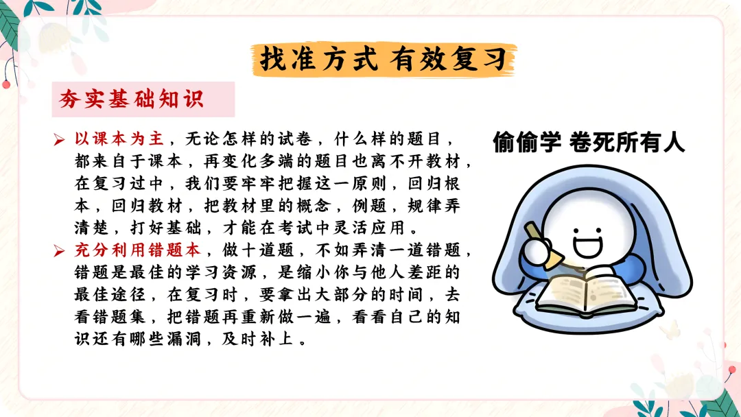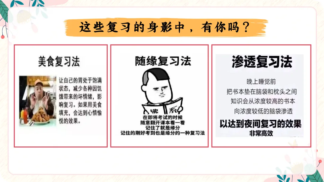 刚才给大家介绍的这些复习方法,都是一些玩笑,大家切勿模仿。复习是一件严肃的事情,我们要认真对待,找到适合自己的复习方法,才能在考试中取得好成绩。