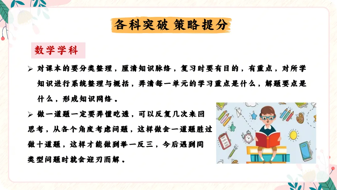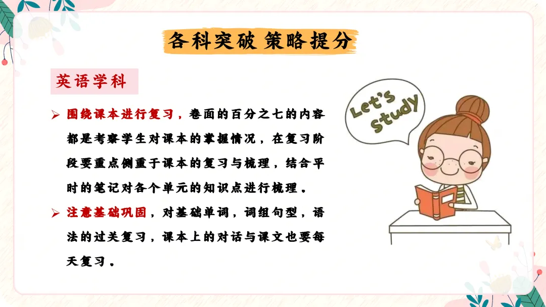 严格时间管理也是复习中非常重要的一环。有些同学平时不用功,到了考试前,就特别下劲,一刻也不放松,走路看书,吃饭看书,彻夜看书。殊不知,这样的复习往往都是无效的。我们要制定合适的复习计划,每天看多少书,做多少题,背几课P23 各科突破策略提分 - 英语学科