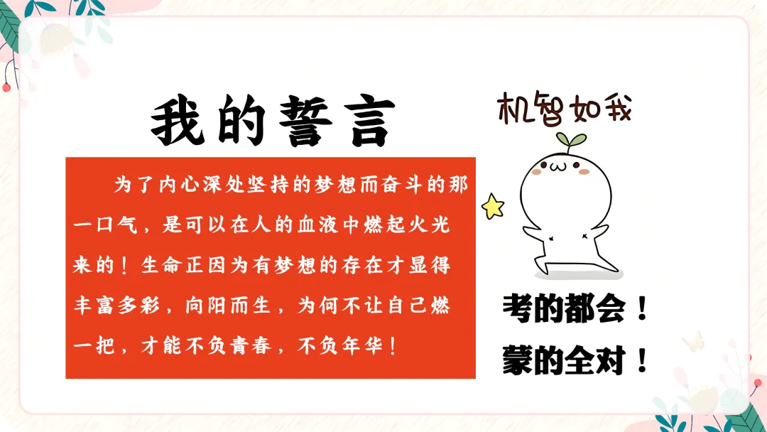 同学们,为了内心深处坚持的梦想而奋斗的那一口气,是可以在人的血液中燃起火光来的!生命正因为有梦想的存在才显得丰富多彩,向阳而生,为何不让自己燃一把,才能不负青春,不负年华!我相信,只要我们努力拼搏,就一定能实现自己的目标,考的都会,蒙的全对!