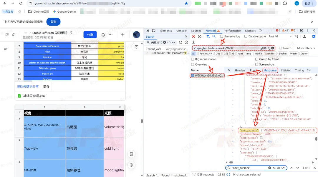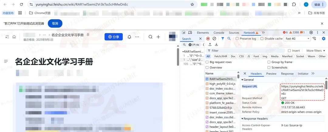也就是在应用启动参数里输入的飞书链接。RPA机器人先打开它,并从页面加载过程里拿到关键接口的返回值。