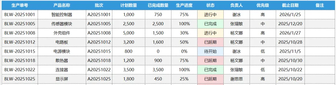 这样一来,哪些订单紧急、哪些已延期,一眼就能看出,便于及时调整生产安排。