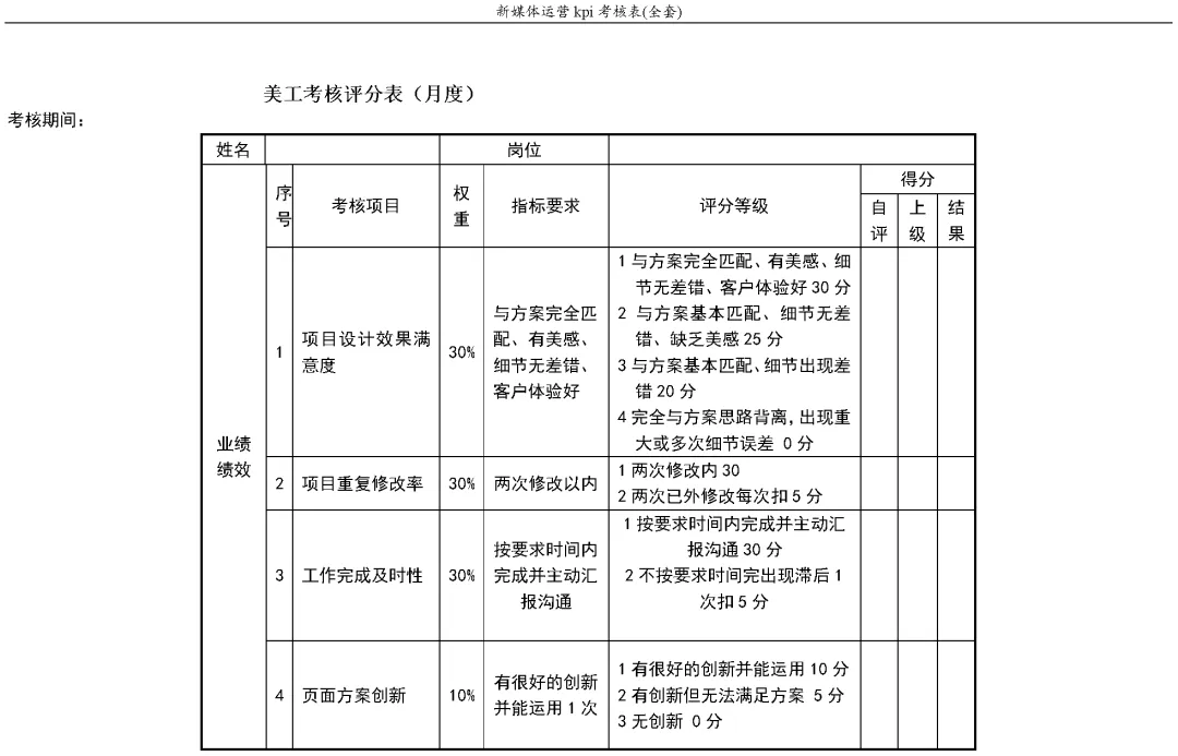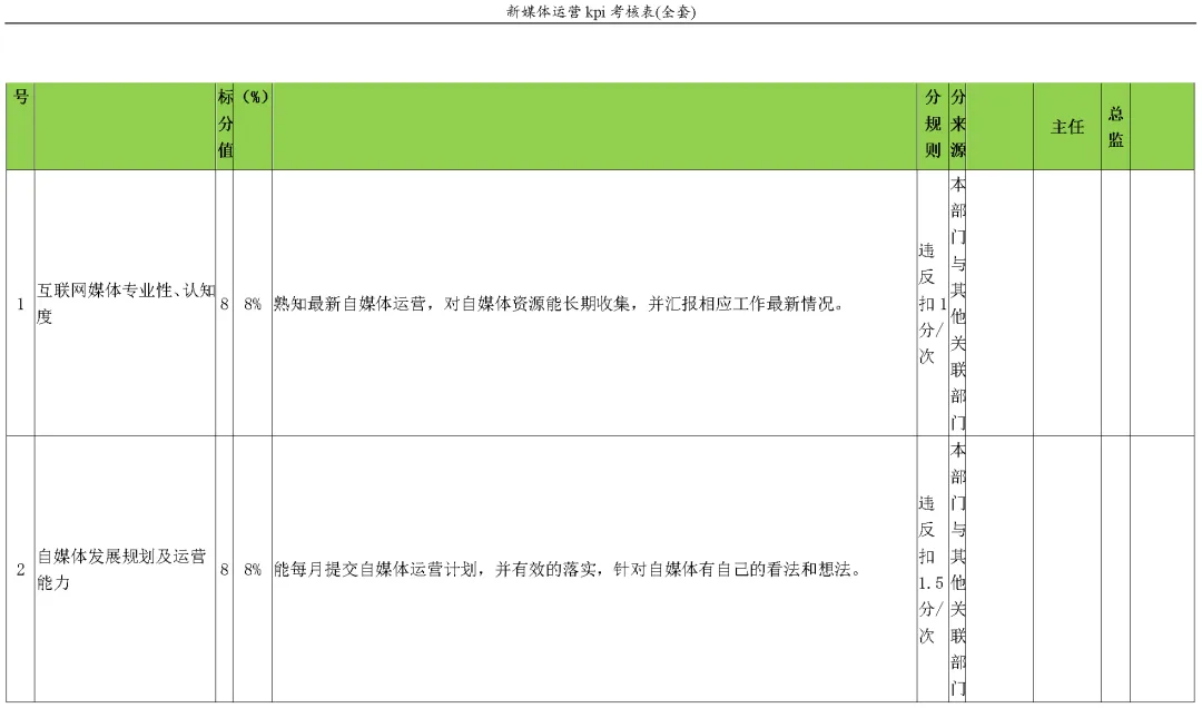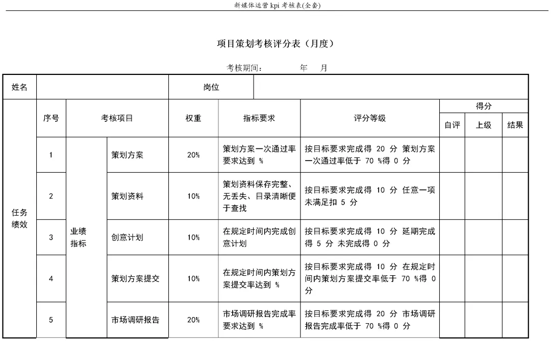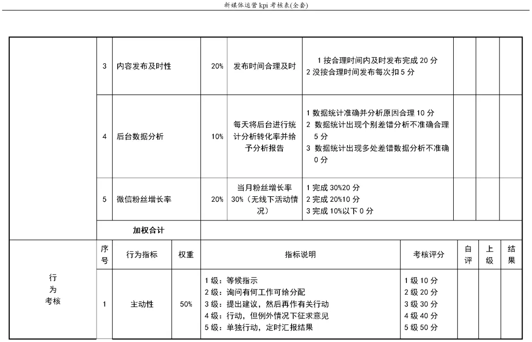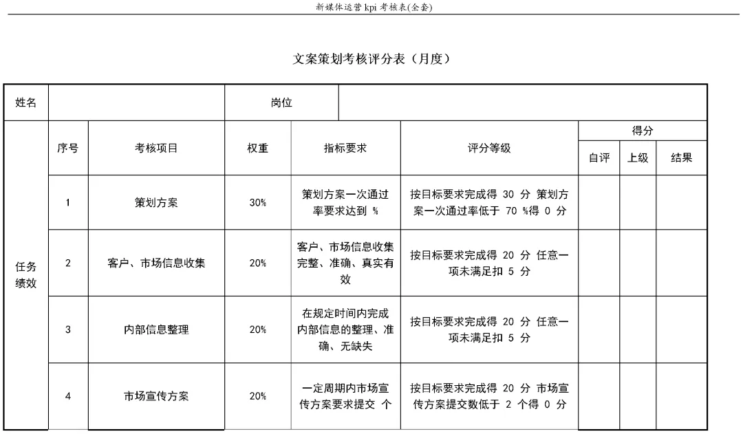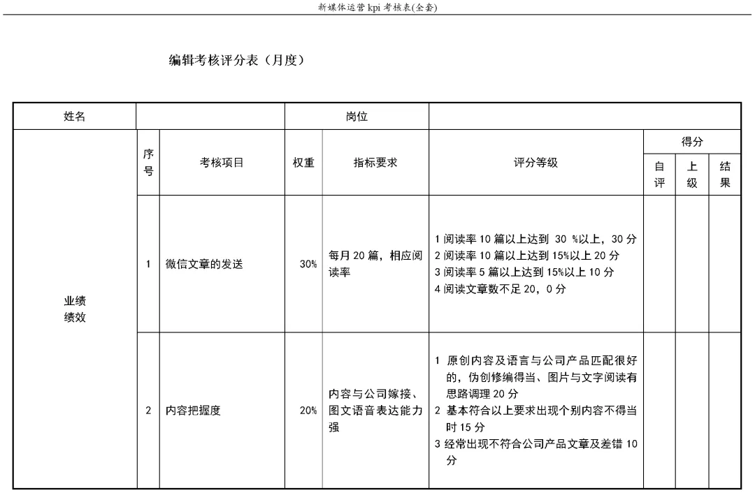 本资料为《新媒体运营KPI考核表(Word文档)》,欢迎加入会员领取!