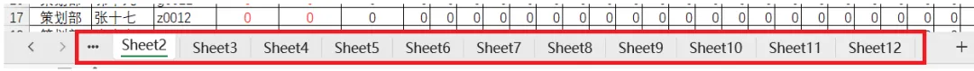 例如,以下Excel文档中,包含了13个不同的工作表(包含第一个“总览”工作表),每个工作表里都保存着不同的数据表格。现在,需要把这13个工作表分别单独保存,变成13个独立的Excel文件