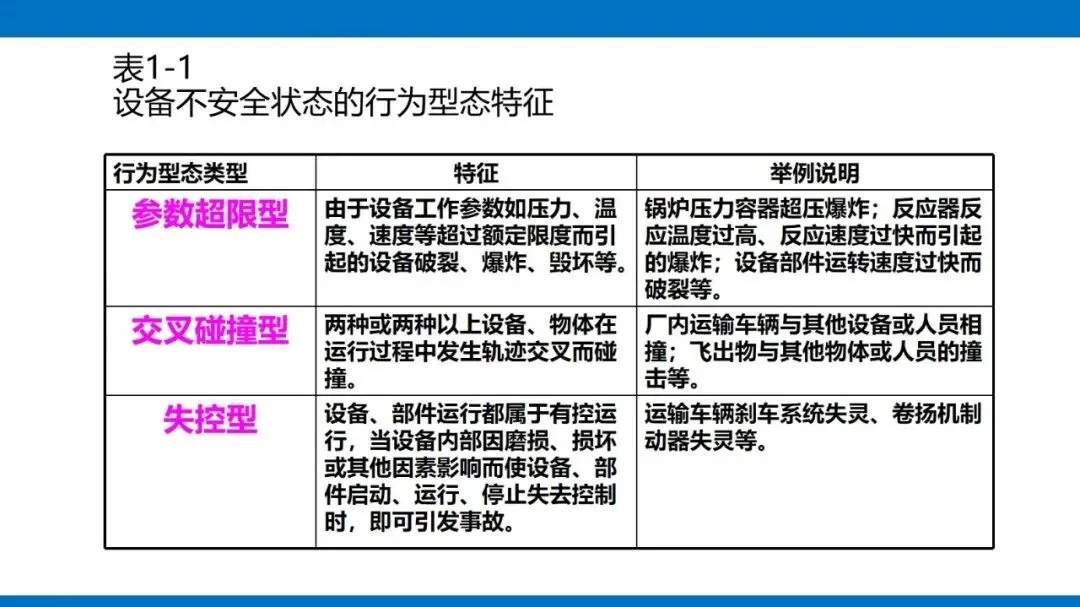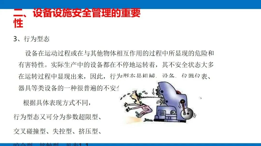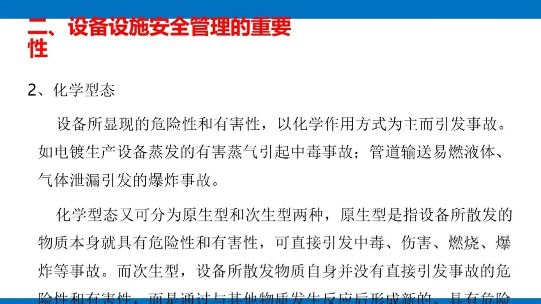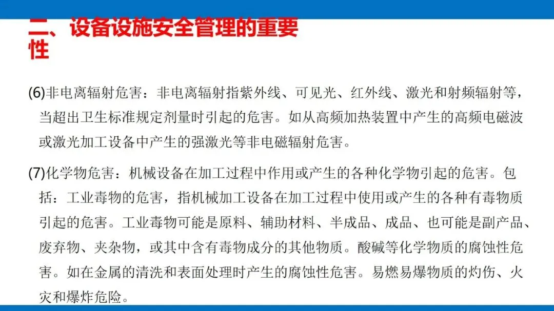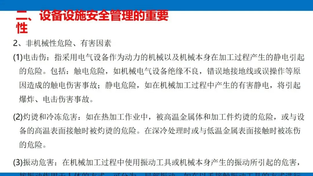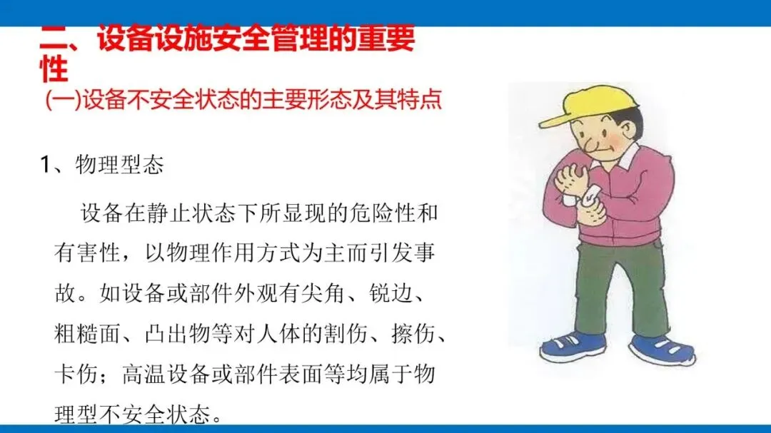 风险源头主要是第一类危险源,也就是设备固有的能量(像电能、机械能等)和有害物质,这些是生产必需的,没法消除,只能通过科学管控实现安全与生产的平衡。同时,设备的不安全状态也不能忽视,包括物理、化学、行为、能量四种形态,还有机械性、非机械性的危险有害因素,比如机械挤压、电击、粉尘危害等,都是管控要重点关注的对象。