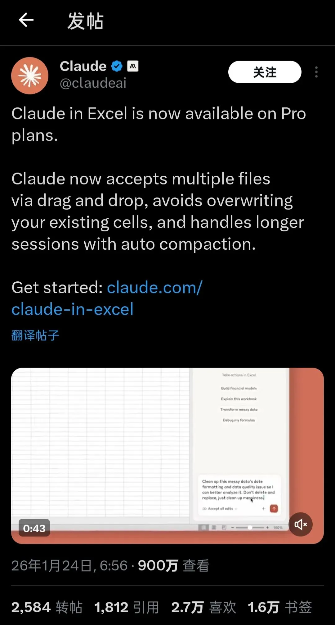 Claude 昨天宣布Claude in Excel正式向Pro用户发布。