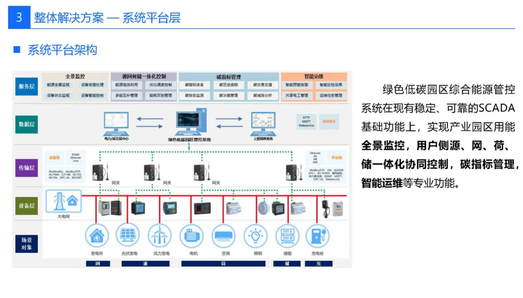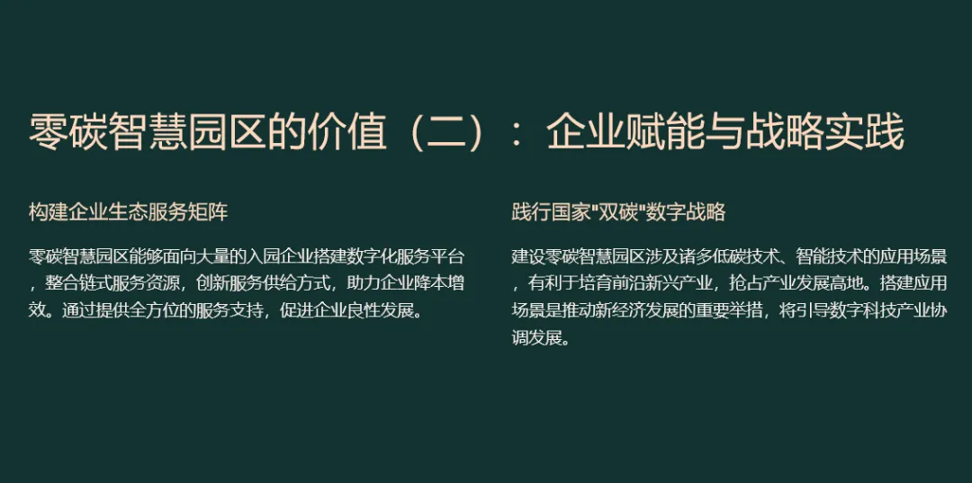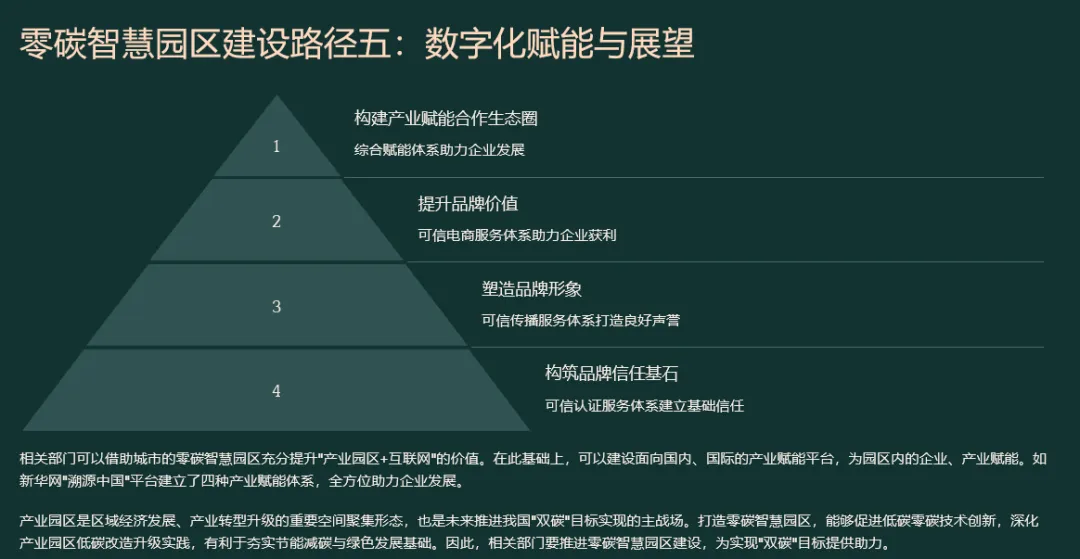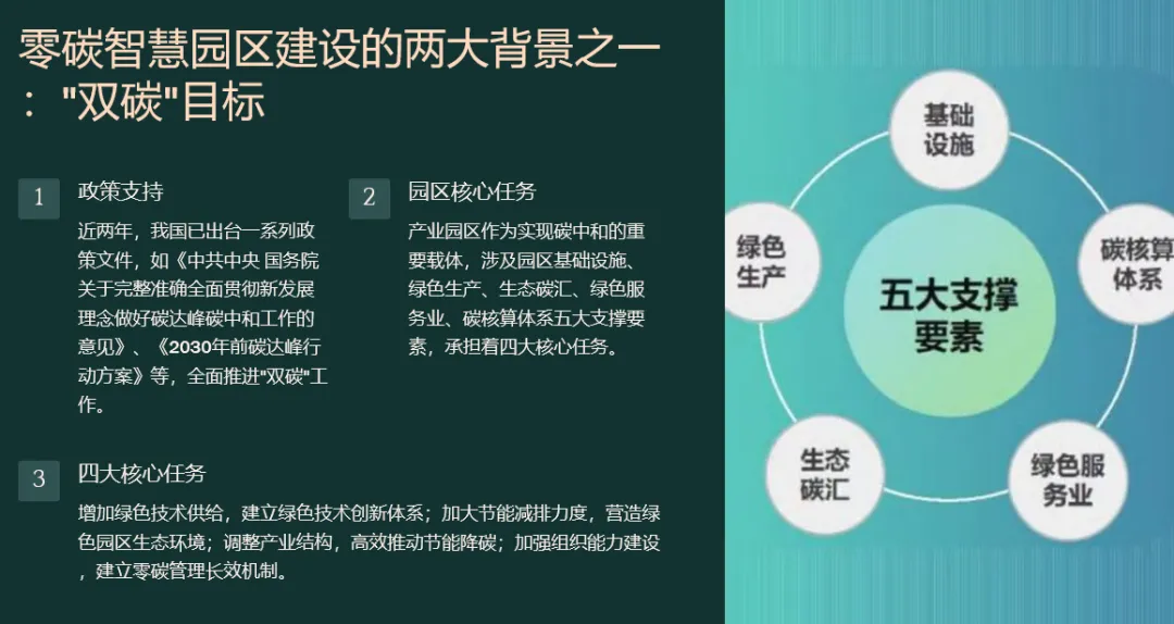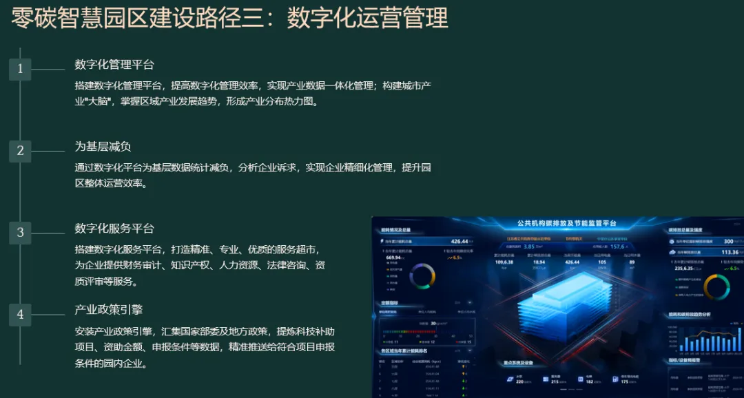 先“盘家底”再“定路线”。园区以碳排放核算为起点,建立覆盖范围一、二、三的实时“碳账户”,形成数字孪生底图;据此设定“碳达峰—碳中和”双时间轴目标,并与地方碳考核、碳交易规则对接,输出“1张蓝图+1套指标+1个平台”的总体框架,确保后续建设可量化、可考核、可融资。