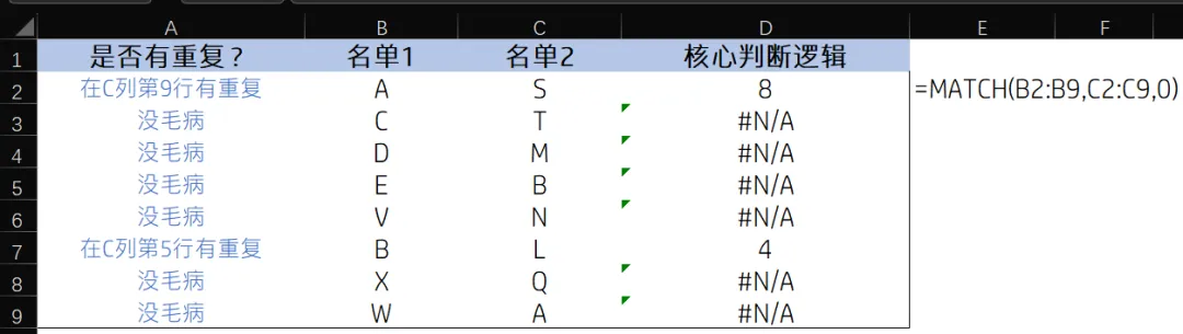 工作原理:MATCH函数首先会在B列里取出第一个数,也即B2中的"A", 然后遍历C列,寻找是否有相同的数据,如果有则返回它在C2:C9中的行号,如果没有就躺平报错。接着取出B3里的数据进行比对...直到比对完B列所有的数据。