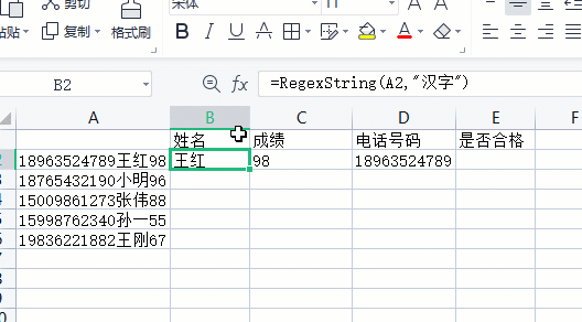 公式:=RegexString(文本,正则表达式)