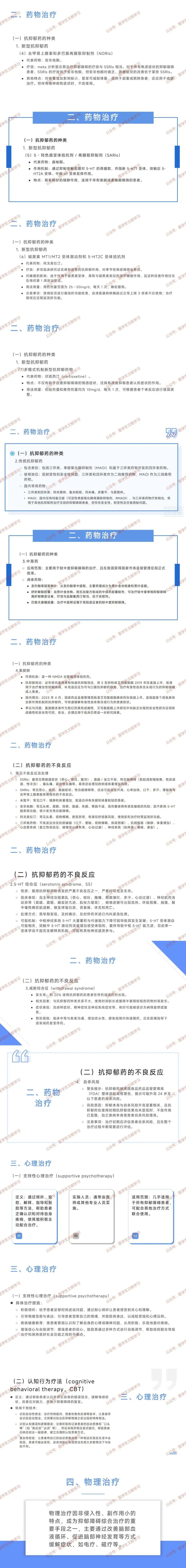 联合用药:一般不推荐,难治性患者可联用 2 种不同机制抗抑郁药,或联合锂盐、非典型抗精神病药;伴精神病性症状需联用抗精神病药。